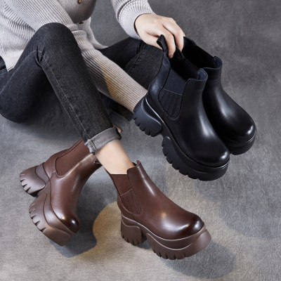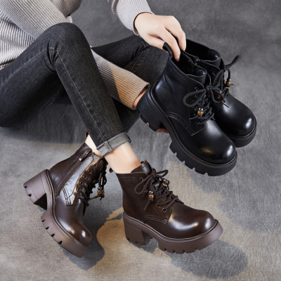 头层牛皮粗高跟靴女秋季轻奢单靴小个子增高短靴英伦风马丁靴