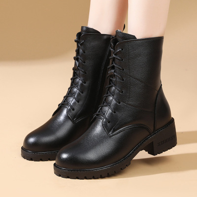 中年妈妈靴子女冬加绒马丁靴女高跟小跟中筒靴加绒棉靴软皮靴棉靴