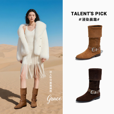 复古堆堆靴秋冬新款粗跟扣带西部牛仔英伦风骑士靴休闲长筒靴