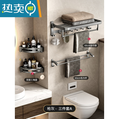 敬平毛巾架免打孔太空铝浴室壁挂收纳厕所挂杆挂浴巾架子卫生间置物架 [雅致款]推荐♥三件套A-枪灰色浴室置物架