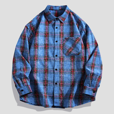 男装春秋装新款男士长袖衬衫高街潮牌时尚宽松复古格子衬衣男外套