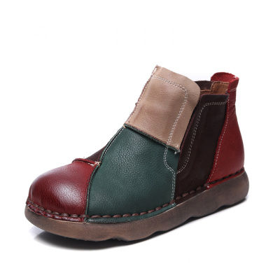 头层牛皮短靴女冬季新款复古百搭圆头平底拼色休闲女式单鞋