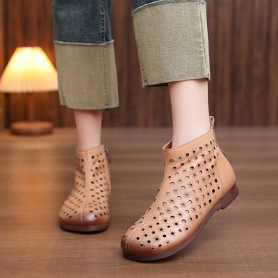 头层牛皮短靴女2026春季新款镂空休闲透气侧拉链圆头平底洞洞鞋