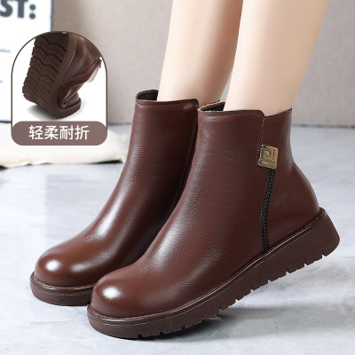 冬季棉鞋女秋冬季中年软底短靴平底皮鞋时尚休闲加绒靴子
