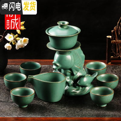 三维工匠陶瓷功夫茶具套装家用懒人泡茶半全自动出水石磨冲茶器茶壶茶杯 自动茶具[年年有鱼]孔雀绿