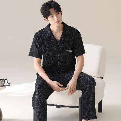 睡衣男皱布夏季开衫短袖长裤加肥加大码宽松休闲青少年家居服套装