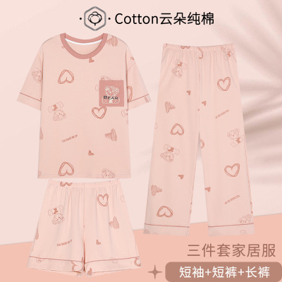 春夏季棉质睡衣女短袖七分裤三件套可爱卡通家居服可外穿大码