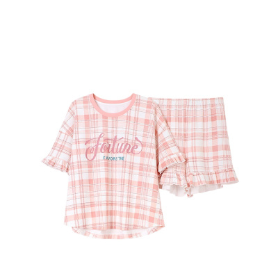 红豆居家21年夏季新款情侣款男士女士纯棉睡衣男式女式卡通刺绣清爽格纹休闲风短袖家居服套装可外穿
