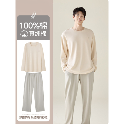 啄木鸟纯棉男士睡衣春秋冬季2025新款圆领长袖长裤简单家居服套装