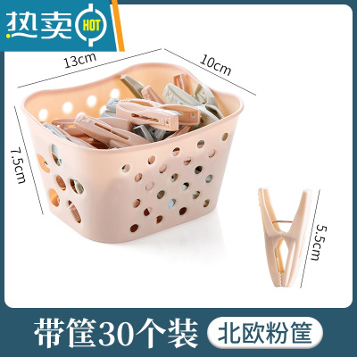 敬平晾衣夹阳台晒被子晾袜子器防风固定衣服大号夹子小晒衣夹收纳篮 带筐30个装(北欧粉)