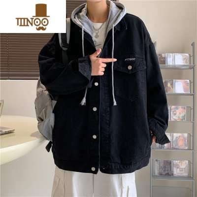 YANXU拼接连帽牛仔外套男国潮机能bf风潮流宽松休闲情侣工装夹克
