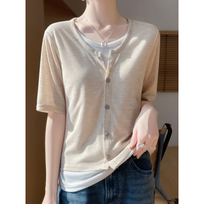 夏季新款圆领假两件针织T恤女开衫五分半袖拼色薄款打底百搭上衣