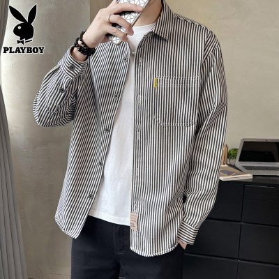 花花公子长袖衬衫男士纯棉条纹上衣服2025年秋季休闲外套衬衣男款