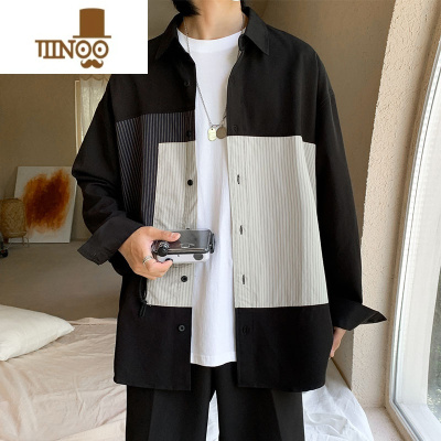 YANXU夏季薄款长袖衬衫男拼色冰丝潮牌休闲日系港风设计感小众条纹衬衣