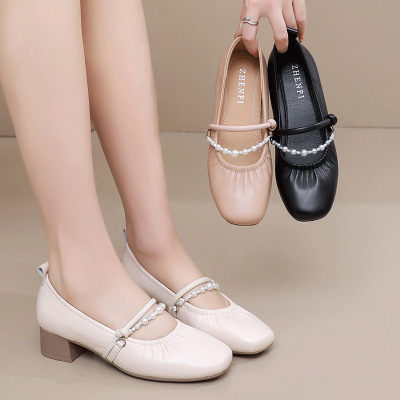 25新款真皮方头粗跟玛丽珍鞋女百搭时尚浅口四季单鞋女通勤工作鞋