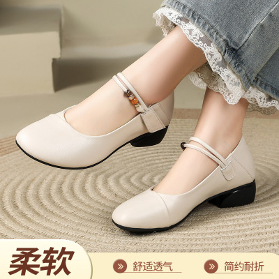 新款真皮粗跟单鞋女妈妈鞋中跟气质软底法式职业四季工作鞋