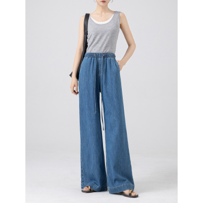 柔顺垂感宽松牛仔筒喇长裤女全松紧抽绳简约阔腿拖地裤薄