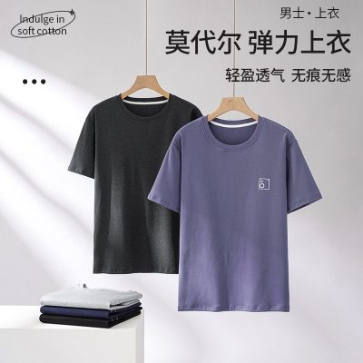 男士睡衣夏季纯色休闲短袖可外穿宽松大码螺纹冰丝单件上衣家居服