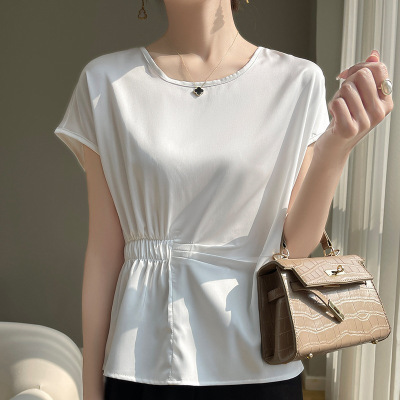 裙摆式小衫收腰洋气套头圆领上衣女夏季宽松缎面韩版配半身裙小衫