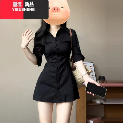 YIBUSHENG黑色衬衫连衣裙女季小个子2024新款收腰显瘦气质风情万种短裙子