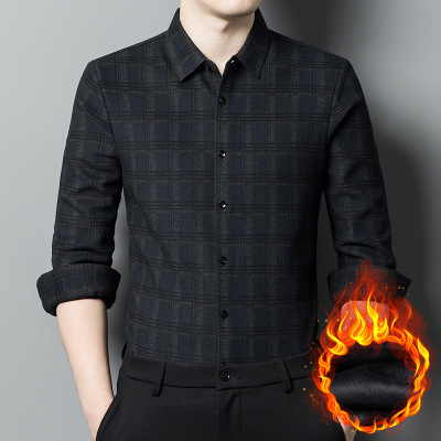 格子男式加绒衬衫中青年商务休闲长袖加厚保暖衬衣冬装磨毛爸爸装
