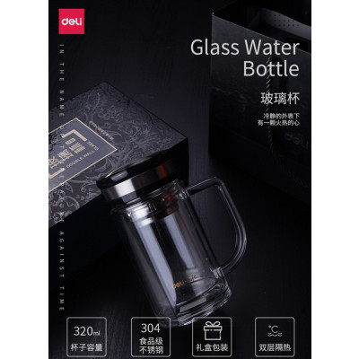 得力(deli)320ml双层隔热玻璃杯 商务手柄茶杯 礼盒装 8989