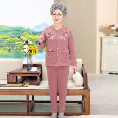 中年人冬装女奶奶保暖内衣套装加厚妈妈加绒绣花开衫套装两件套
