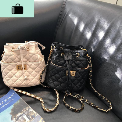 乌77韩国炒火百搭纯色菱格链条包抽绳PU水桶包单肩斜挎女包小包包NEW LAKE女斜挎包
