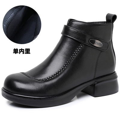 复古短靴女新款中跟加绒棉靴女圆头粗跟单靴牛皮短靴马丁靴