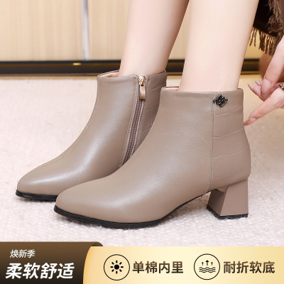 秋冬季加绒尖头新款小跟短棉靴气质法式真皮复古春秋时装单靴