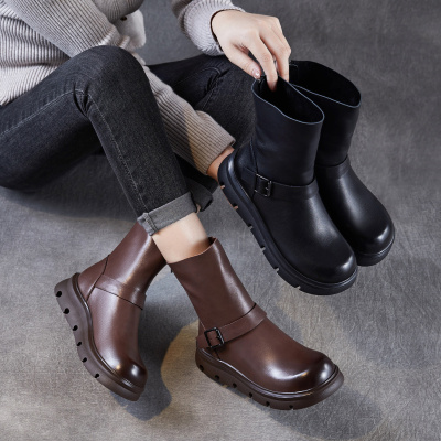 真皮厚底短靴女新款秋冬复古中筒马丁靴牛皮单靴后拉链倒靴子