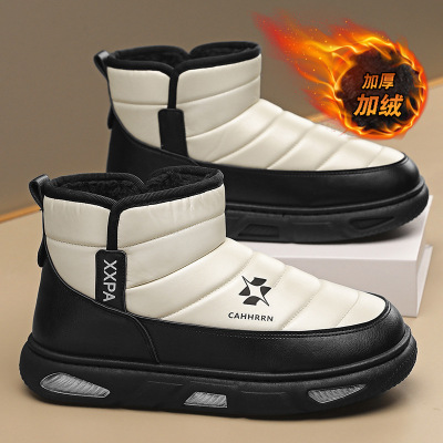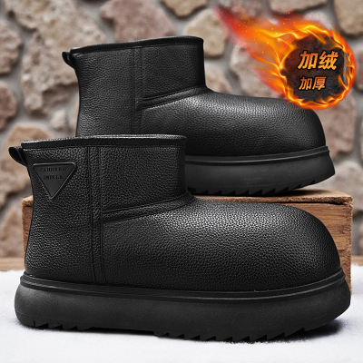 新款男鞋冬季保暖雪地靴高帮皮面厚底套脚户外棉鞋加绒日常