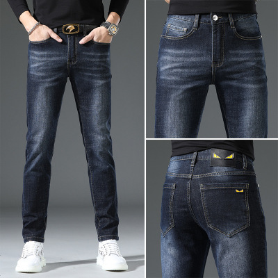 欧货高端蓝色牛仔裤男秋冬季加绒潮牌修身简约弹力小脚休闲长裤男