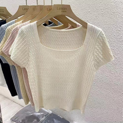 美式复古方领短袖针织衫女夏季新款修身短款高腰正肩薄款纯色上衣