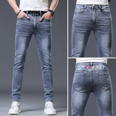 轻奢欧货牛仔裤男潮流新款浅灰色修身小脚夏季潮牌休闲长裤子