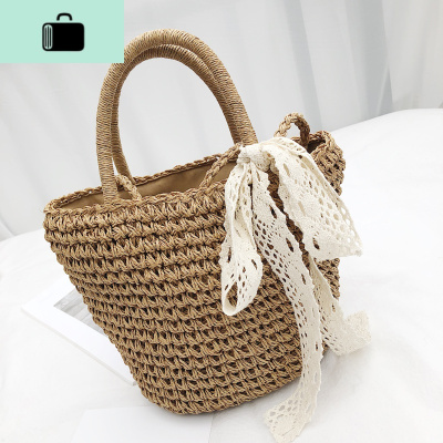 编包斜跨包海边度假沙滩包2019新款手提单肩包蝴蝶结编织包女夏NEW LAKE 卡其色+蕾丝飘带可斜跨女斜挎包