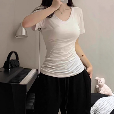 含棉 简约欧美基础款短袖T恤夏季修身短款正肩V领纯色韩版上衣潮