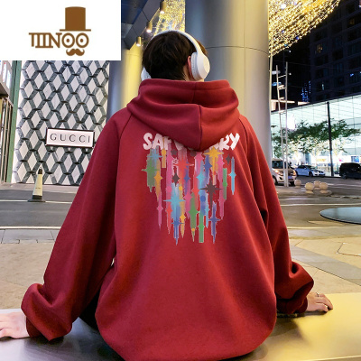 YANXU酒红色卫衣男2023新款欧美高街潮牌hiphop外套情侣装感上衣服