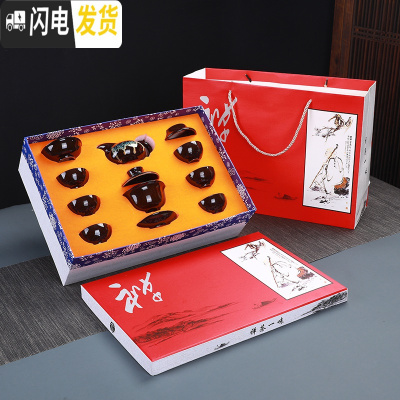 三维工匠窑变功夫茶具套装家用天目釉建盏钧窑陶瓷茶壶杯子整套盖碗茶盘 10头窑变盖碗茶具