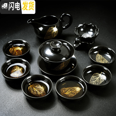 三维工匠整套茶具套装家用简约黑陶瓷金木叶盏功夫茶杯子泡茶盖碗茶壶茶盘 10头黑釉一金叶盖碗茶具