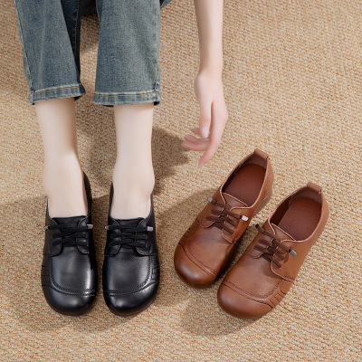 热卖牛皮女鞋圆头平跟软底妈妈中老年女单鞋