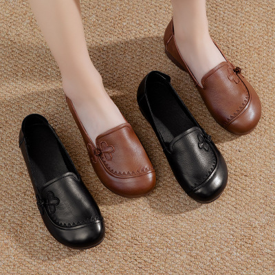 真皮圆头复古妈妈单鞋女百搭休闲舒适平跟软底老人鞋子