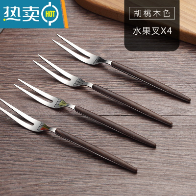 敬平304不锈钢水果叉套装北欧家用甜品儿童勺子水果签果插西餐二齿叉 胡桃木色水果叉4个