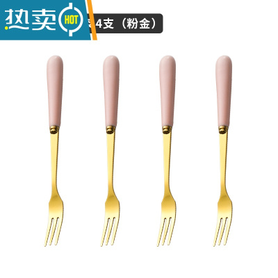 敬平水果叉子可爱不锈钢轻奢甜品勺收纳罐套装家用高端儿童安全水果签 陶瓷柄水果叉4支(粉金)