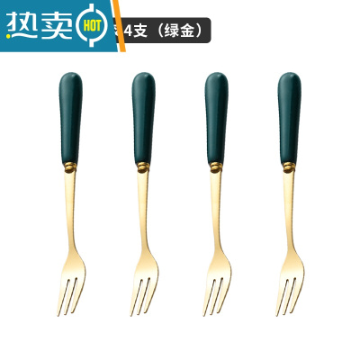 敬平水果叉子可爱不锈钢轻奢甜品勺收纳罐套装家用高端儿童安全水果签 陶瓷柄水果叉4支(绿金)