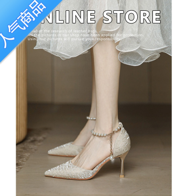 SUNTEK香槟色婚鞋伴娘鞋日常可穿2023夏季一字带珍珠配旗袍包头高跟鞋女