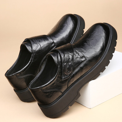 休闲皮鞋男款2025春季新款商务正装黑色厚底增高圆头男士大头皮鞋