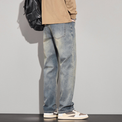 广东增城牛仔裤男士时尚新款复古做旧水洗宽松微弹力百搭直筒裤男