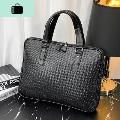 编织横款手提包男士商务皮电脑包公文包大容量斜跨手工包NEW LAKE 黑色公文包