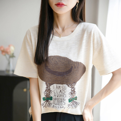 草帽麻花辫竹节麻短袖上衣夏季新款宽松短袖T恤印花